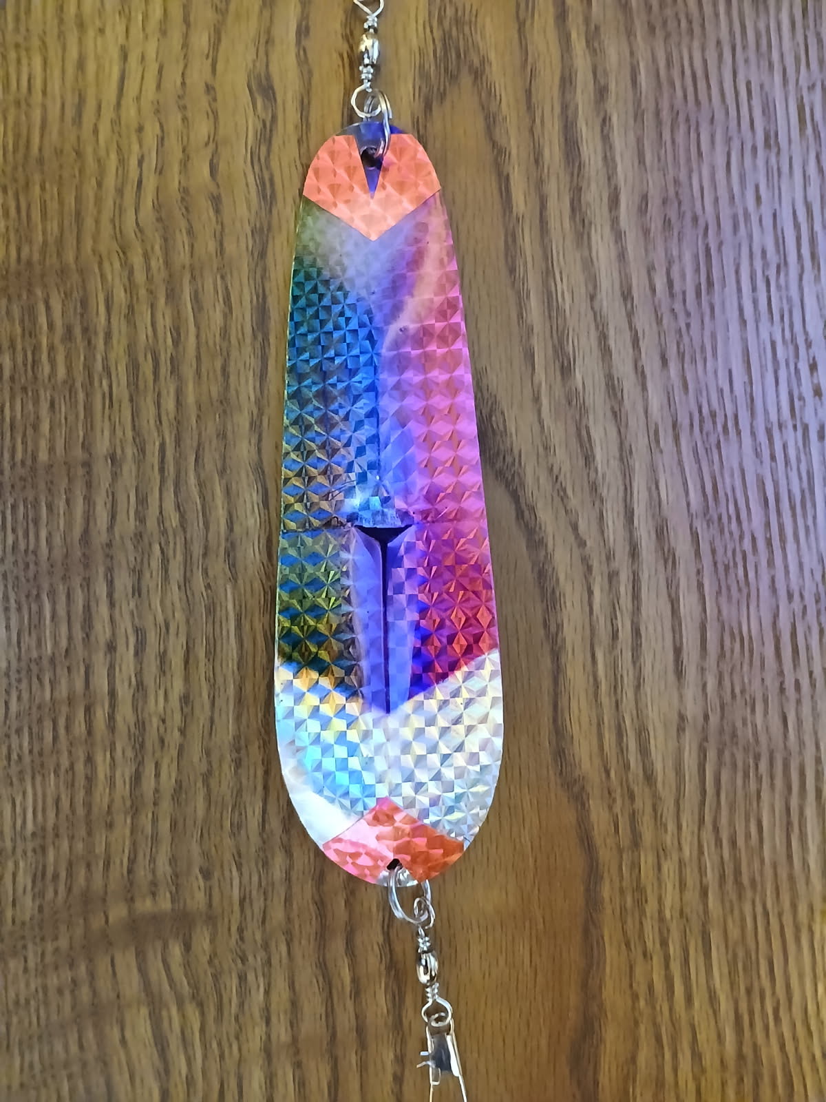 This Kach-Moor dodger boasts a vibrant rainbow with pink tips. Designed to attract and entice, it’s ready to signal, “Come and get me!” With its reflective qualities, this flasher is not just a tool; it’s a visual delight that adds excitement to any angler’s tackle box. Whether you’re a seasoned pro or a novice fisherman, this flasher will enhance your fishing experience and increase your chances of landing the big one!